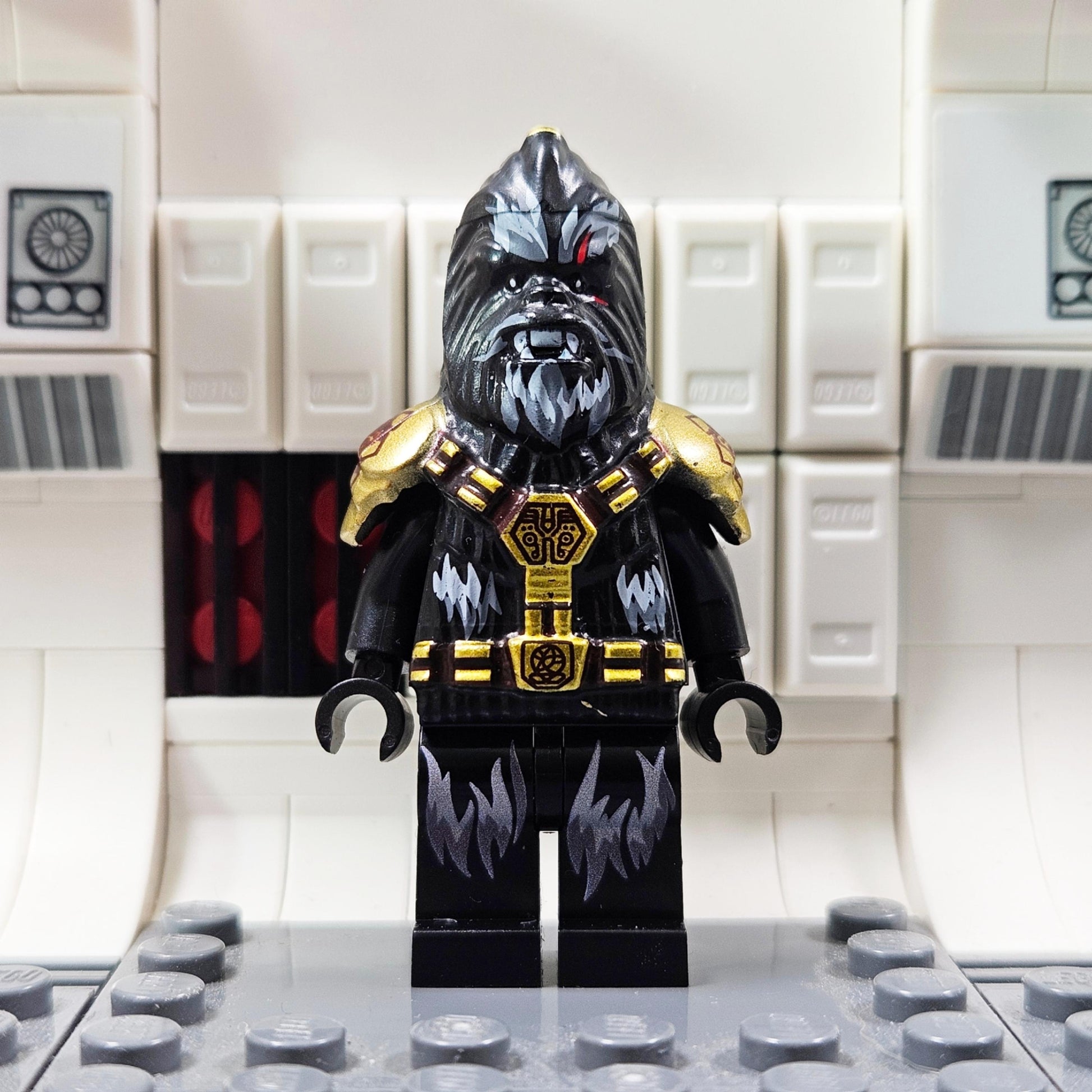 This fierce custom Black Krrsantan minifigure is crafted using all official parts, featuring a custom-molded headpiece with detailed pad printing for maximum accuracy. His powerful stance is completed with custom UV-printed legs, making him as battle-ready as he is collectible. Built like a beast—printed like a legend.